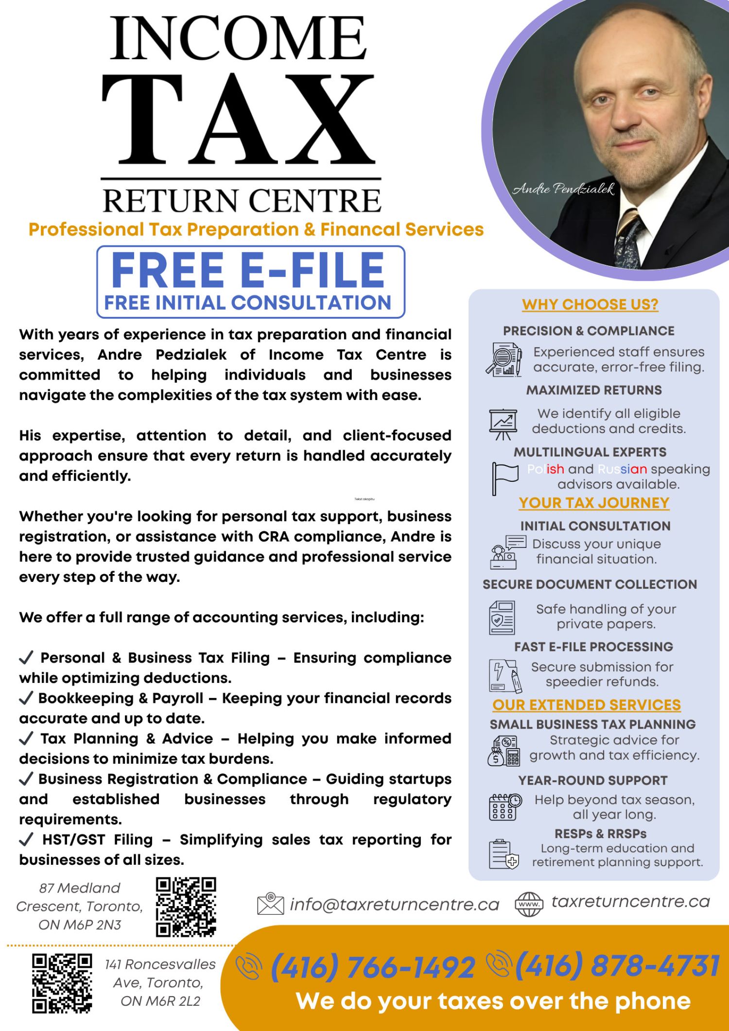April 30th is just around the corner! Have you filed your taxes yet? Don't wait until the last minute and risk CRA late penalties. Let the experts handle the math while you relax!Since 1996, the Income Tax Return Centre has been providing trusted, accurate, and fast tax preparation services in West Toronto. We ensure you get every dollar you are legally entitled to.Who do we help? ️ Individuals & Families (T1) ️ Self-Employed & Contractors (Maximize your home office/vehicle deductions!) ️ Small Businesses & Corporations (T2, GST/HST, Bookkeeping) ️ Newcomers to Canada & Students ️ SeniorsWhy choose us?Decades of Experience: We know the Canadian tax system inside and out.100% CRA Compliant: Audit-proof your returns.Multi-Language Support: We speak English, Polish, and Russian.Convenient Filing: In-person appointments or fully remote (email/phone) filing available!Stop stressing over receipts and complicated forms. Book your FREE initial consultation today and get your taxes done right! Two Convenient Toronto Locations:141 Roncesvalles Ave. (416) 766-149287 Medland Crescent (416) 878-4731 Website: www.taxreturncentre.caDon't miss the deadline! Call us today to secure your spot.